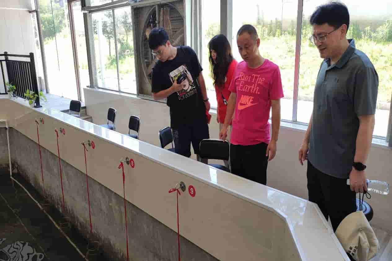 图为实践队员观察鱼虾养殖池的净化培养液。大学生新闻通讯员 陈文杰 摄