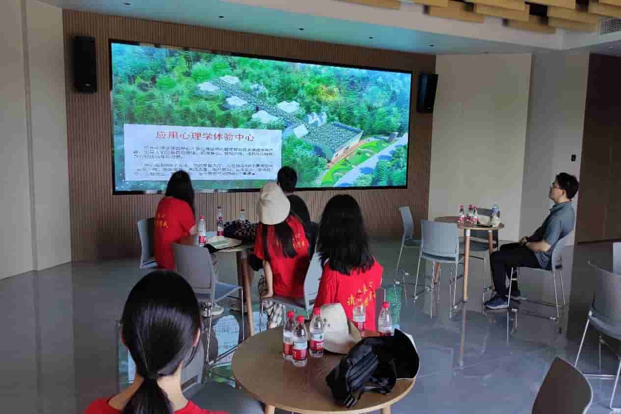 图为实践队员向工作人员询问体验中心的冥想室具体情况。大学生新闻通讯员 陈文杰 摄