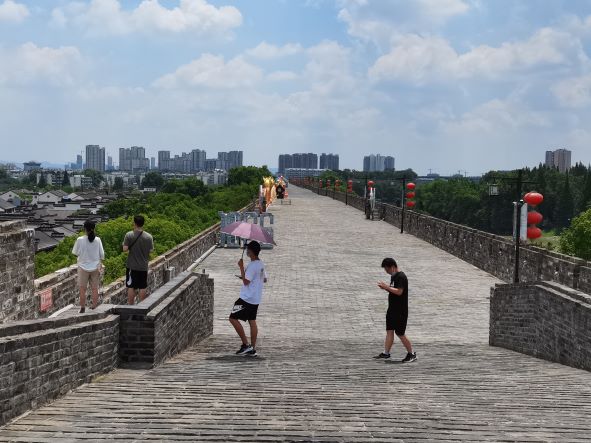 走出南京城墙博物馆,迈出历史的长河,成员们登上了博物馆旁的中华门瓮城。艳阳似火,蝉鸣不绝,跨越历史与时间,斑驳的城墙无言地诉说着一切,登上中华城楼,城内风光一览无余,城墙向两侧绵延而去,将内城紧紧环抱起来。南京明城墙厚重的历史感,绝非一言可以诉说。