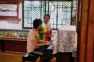 (图片2:实践团成员与李石开老师即兴合作演绎民族歌曲)