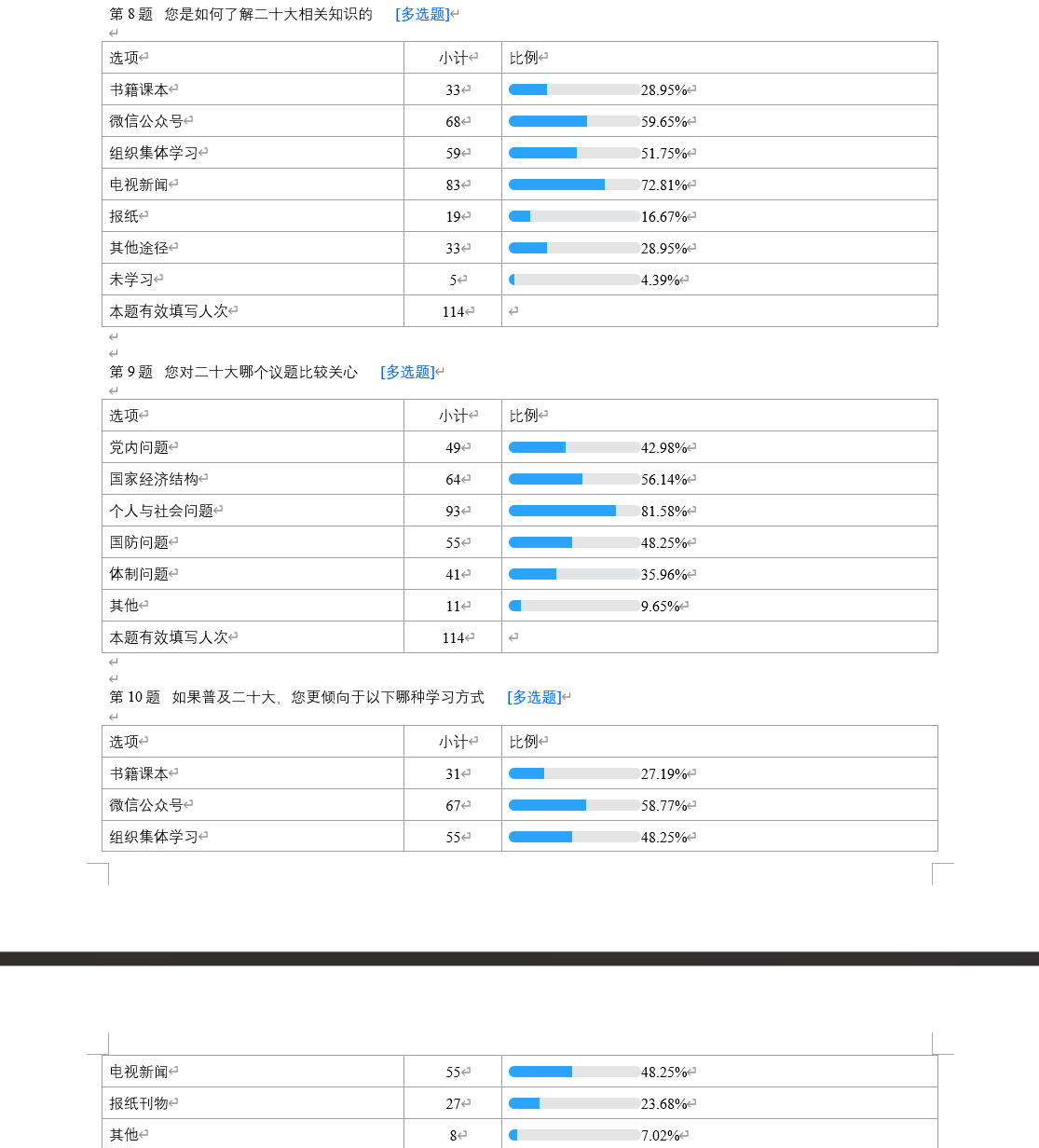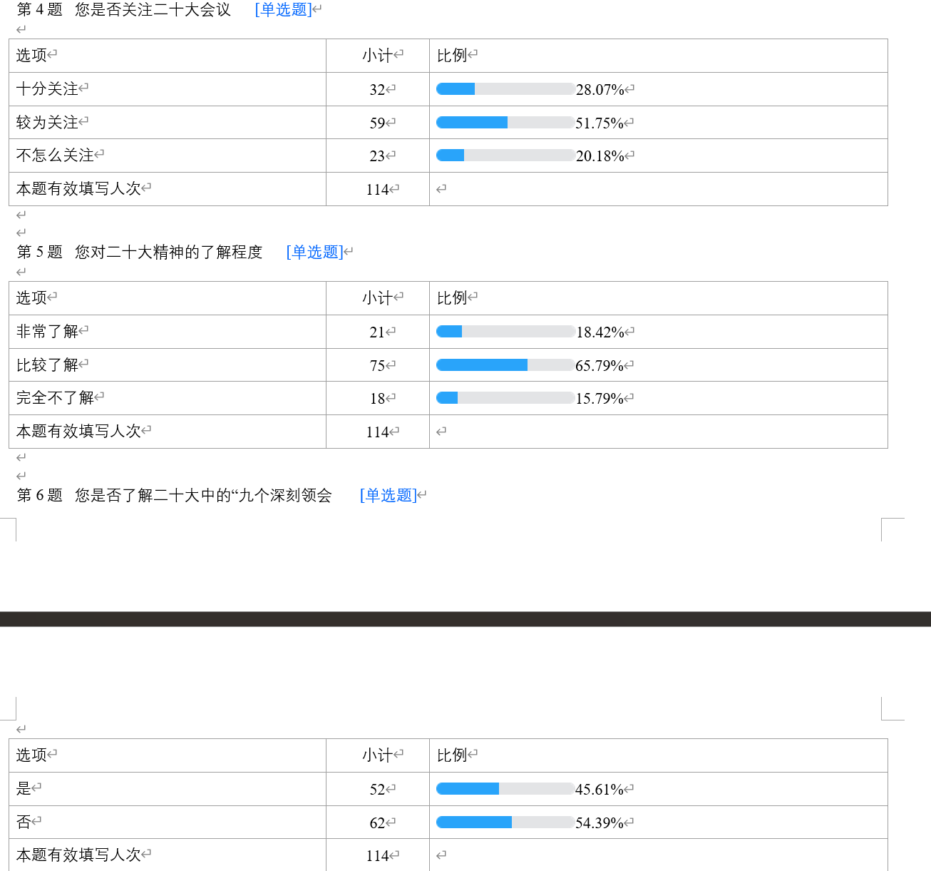 为更全面的地了解到各类人群对二十大的了解情况,我们制作并发布了一份二十大民众普及调查问卷,最终回收有效问卷114份。问卷总共包含十一个问题,大致可以分为四个部分。