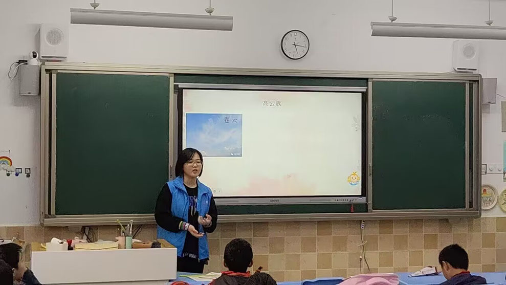 在“水”相关主题的支教活动中,志愿者将云、雨、雪、冰雹等气象的雅称入题,既与传统文化相接,又增长了趣味气象知识,不仅让孩子们知道了云、雨的分类,教会了孩子们一些看云识天气的小知识,还介绍了雪天会出现的美景,通过“下雪不冷化雪冷”的话题激发了孩子们的思考,让孩子们更加深刻的了解了水的变化。志愿者们了解到孩子们对冰雹十分好奇,还告诉了孩子们面对冰雹该如何进行防护。孩子们也在此次活动中增长了气象知识,沉浸在变化万千的自然现象之中。