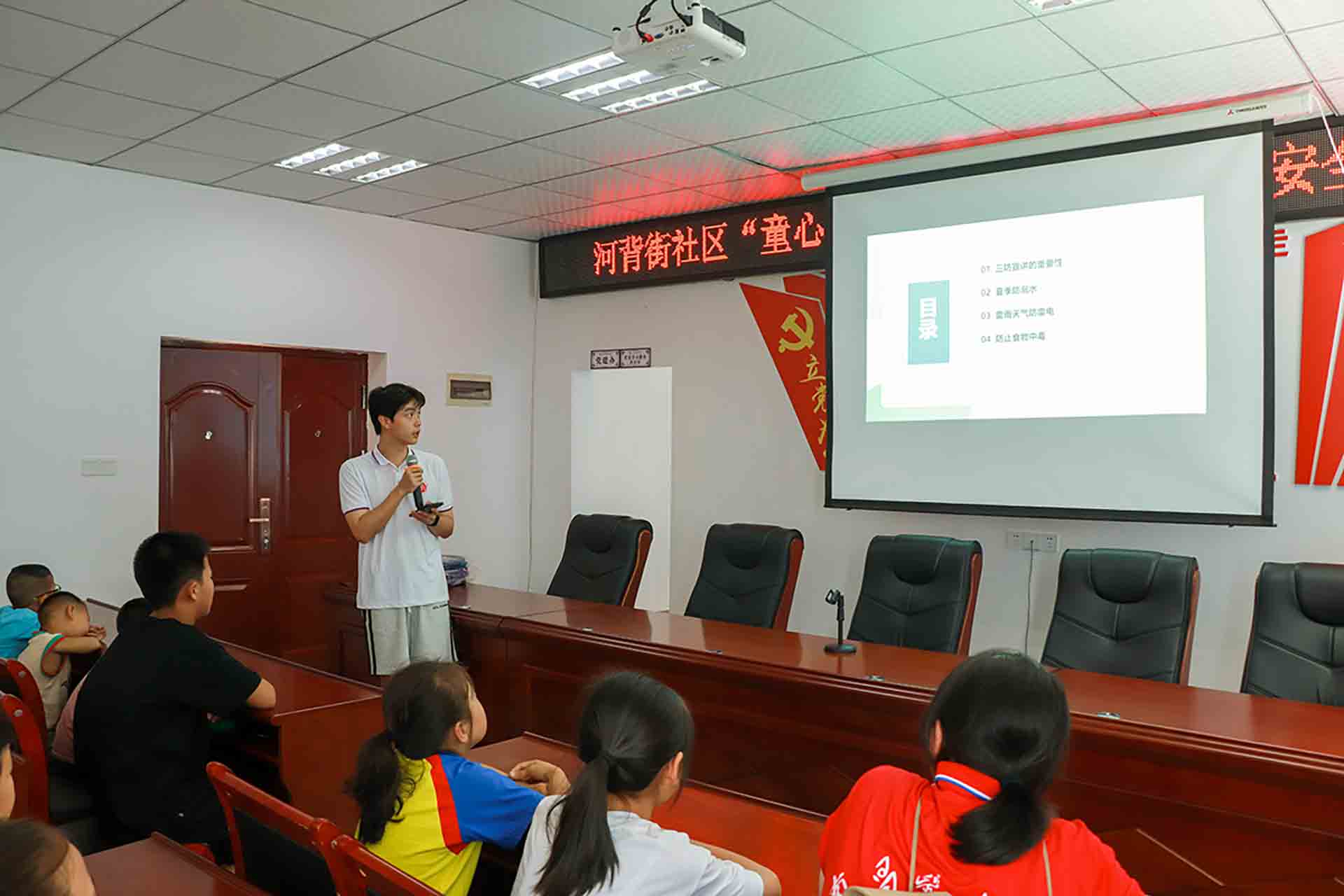 图为彭真腾同学给儿童宣讲暑期“三防”措施