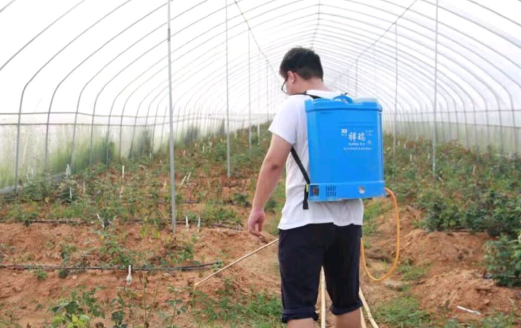 (图为团队成员李心宇自告奋勇参加草莓园喷洒农药的工作)