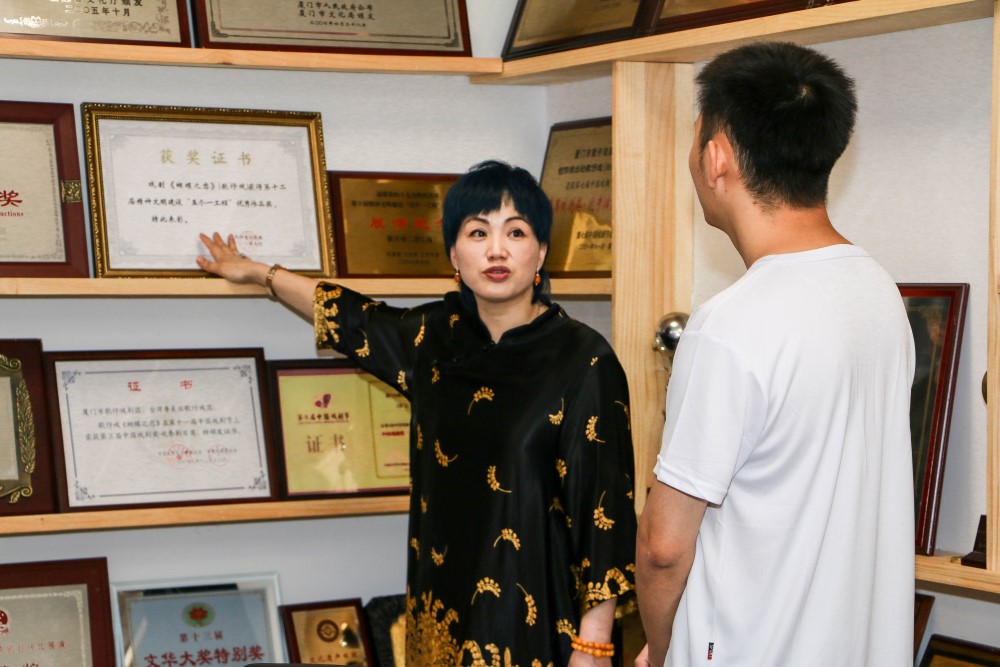 随后,实践队首往厦门歌仔戏研习中心(厦门市歌仔戏剧团)参观学习,厦门歌仔戏研习中心副主任庄海蓉带领实践队成员依次参观了研习中心的实验剧场、化妆间、练功房、鞋帽间和荣誉室。走廊上的剧照记录着剧团的发展,满室的证书诉说着剧团的成就,实践队队员们在了解到戏曲文化的发展与成就的同时,也感受到剧团成员们在闽南戏曲艺术传扬之路上的勠力同心、艰苦奋斗。
