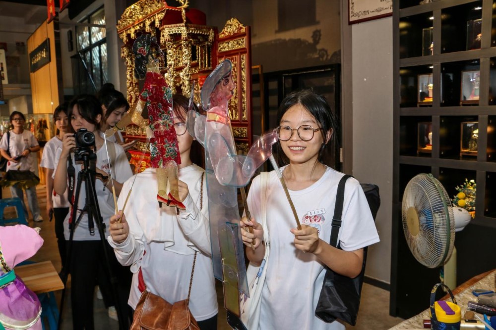 图为实践队队员体验皮影戏表演,感受牛皮、亚克力板等不同材质皮影的操作质感。