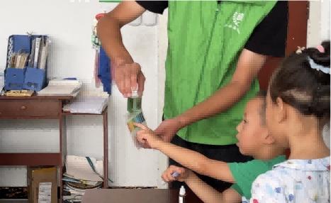同时,实践团开设实验课,向小朋友们科普水质检测小知识。“什么样的是指才是合格的,才能够让我们放心的引用呢?”实验开始前,实践团成员向小朋友们介绍,可以通过测量水的pH值、化学需氧量、总磷、总氮等来了解水质状况,从而判断水源是否安全。接着,实践团成员边示范边讲解,进行水质pH的检测,并让小朋友亲自动手实验。希望这样大手拉小手的教育活动能让小朋友们学有所思,思有所践,践有所悟。