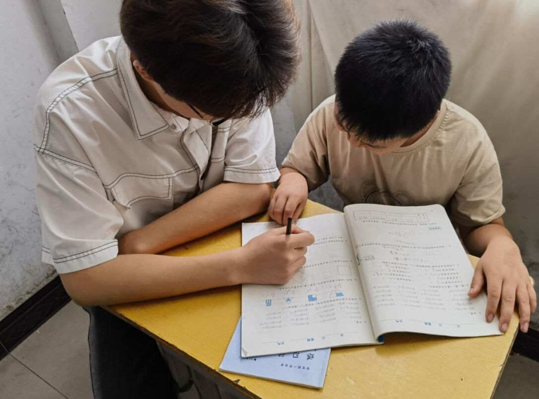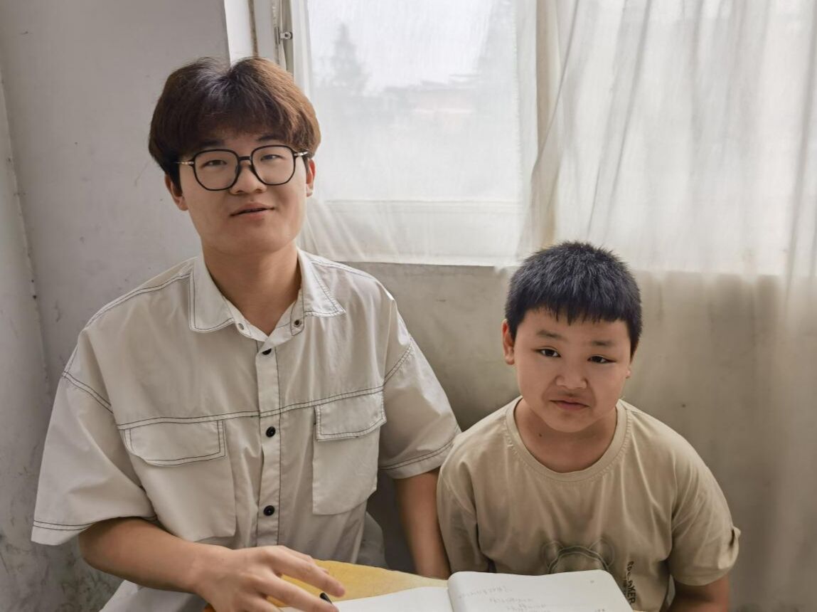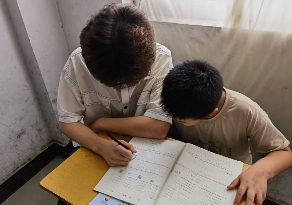 2023年7月17日,在安徽省临泉县老集镇周庄户村里,志愿者周俊龙去往当地村庄的一名留守儿童的家去帮助,辅导他学习,一起玩耍。在他这个年纪,志愿者本身也是一名留守儿童,所以志愿者深知情牵留守,爱暖童心的重要性。