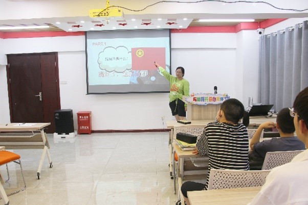 志愿者和小朋友们一起绘制国旗,在绘制过程中,志愿者讲解国旗的基本信息和重要意义,并和小朋友们分享了自己对“爱国”的理解;志愿者以互动问答的方式带领大家学习认识团旗、团徽和团的章程,并一起欣赏、合唱团歌《光荣啊,中国共青团》,在歌声中增强小朋友们对共青团的认识和了解。
