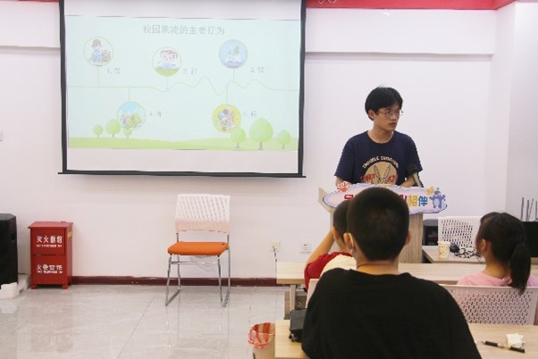 志愿者利用漫画展示实际案例,介绍校园欺凌的定义和概念,讲解校园欺凌的危害,从学校、个人层面分析引发校园欺凌的原因,教授同学们如何运用法律应对校园欺凌,增强小朋友们的法治意识,提高小朋友们用法律保护自身的能力。