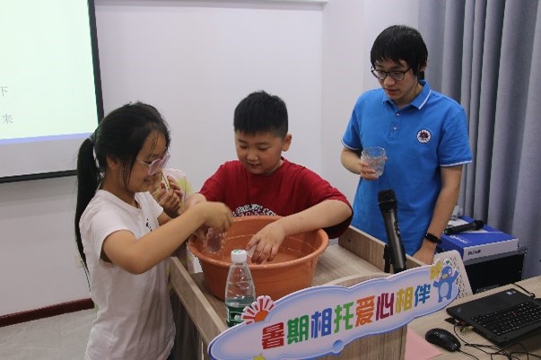 志愿者选取贴近生活的趣味实验,培养小朋友们的科学兴趣。通过“倒不出的水”小实验,帮助同学们认识大气压的存在;通过“瘪了的瓶子”实验,带领同学们理解空气热胀冷缩原理。