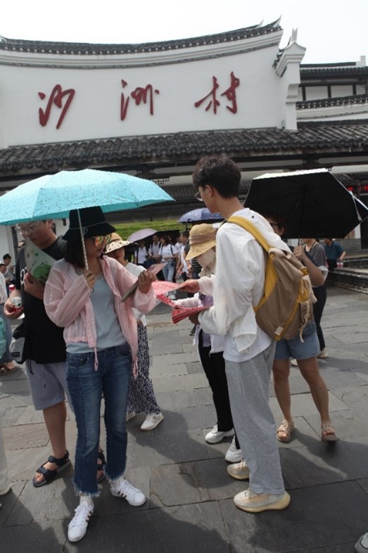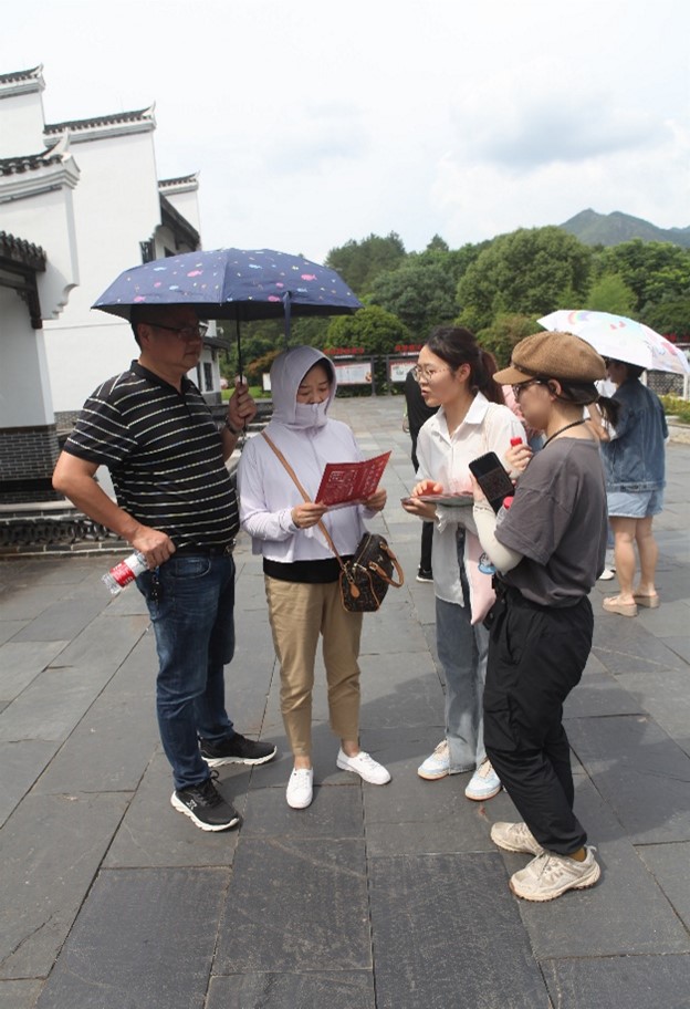 成员们也收集沙洲红色革命文化资料,为调查问卷的编写做相关准备。团队成员记录了村庄展示的重点历史事迹与历史人物,全方位了解沙洲红色文化的继承与传播情况。到达沙洲民俗广场之后,实践团成员们拿出已准备好的“半条被子”红色故事宣传单,向游客们介绍“半条被子”温暖故事,讲述红色经典,弘扬红色精神。