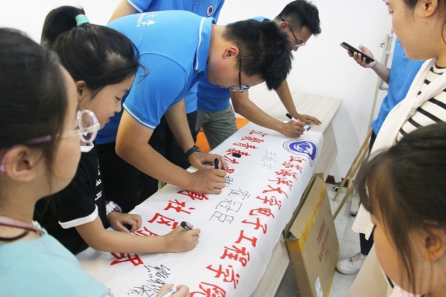 结业仪式后,实践团成员们与街道社区工作人员、小朋友们一起在实践团队旗上签名留念,为本次活动划上一个圆满的句号。