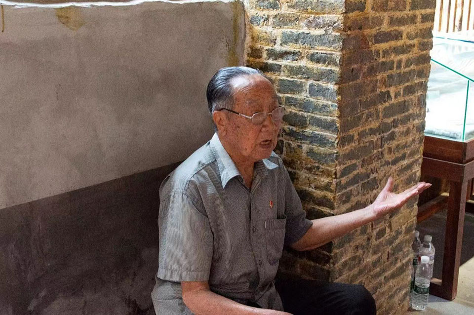 图为老党员曹议为团队成员讲述鲤鱼屯抗战历史。