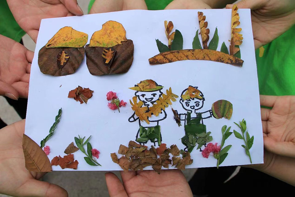 图为团队成员展示由树叶,花枝等制作的拼贴画。