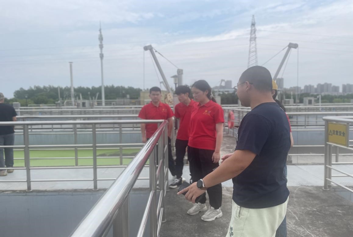 在江苏省启东市城市污水处理厂,实践团成员在工作人员的陪同下依序参观了处理厂内的预处理场所、氧化池、絮凝反应沉淀池、高效纤维滤池、消毒池、生物指示池和污泥浓缩压滤机房,了解了城市生活污水处理的基本流程及原理。团队成员就“该污水处理厂能否确保污水处理质量”与工作人员展开讨论。参观结束后,实践团与工作人员开展了线下座谈交流会。工作人员就实践团提出的关于污水来源及成分、处理方法及成效、处理后污水的去向及用途等问题都进行了详细解答。
