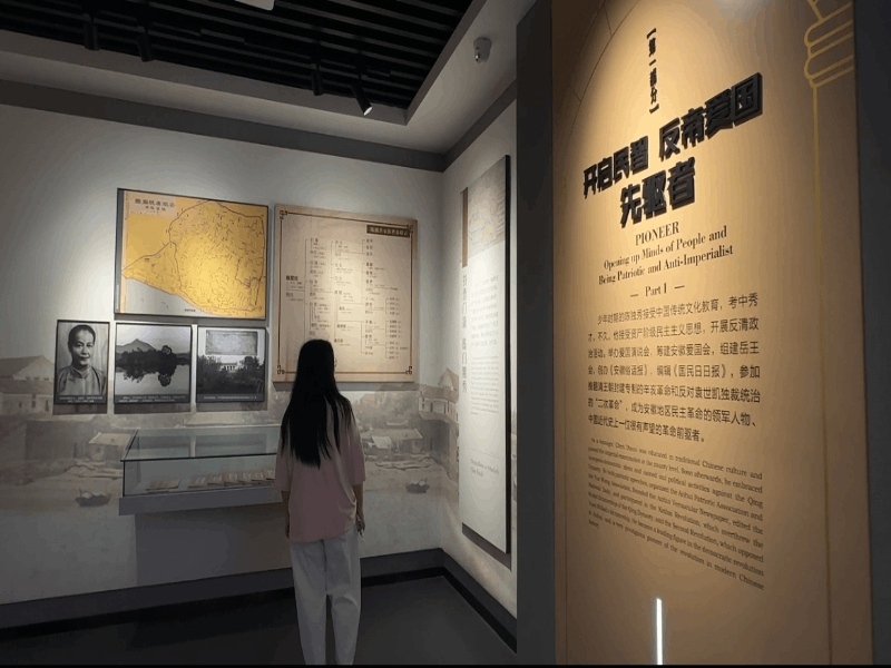 图为讲解员在陈独秀生平事迹陈列馆中讲解