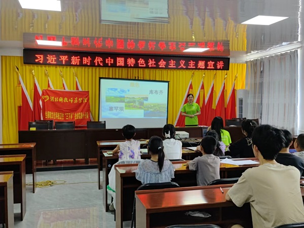 宣讲员站会议室讲台上,开展关于中国特色社会主义思想的主题宣讲。在讲解改革开放和脱贫成就时,介绍了改革开放以来中国的巨大变化,特别是经济领域的飞速发展,使用数据和图表强化观点。分析当前国内外形势,说明继续深化改革开放的必性和前景。并且以详实的数据和生动的图片,展示中国经济总量的提升和脱贫攻克的显著成效。分享成功脱贫的案例和经验,激励村民为实现共同富裕而不懈奋斗。