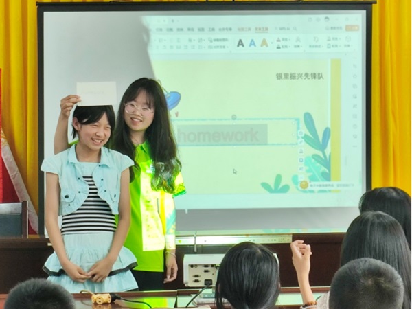 图为英语课上实践团与孩子们在进行单词游戏。尤章跃 摄