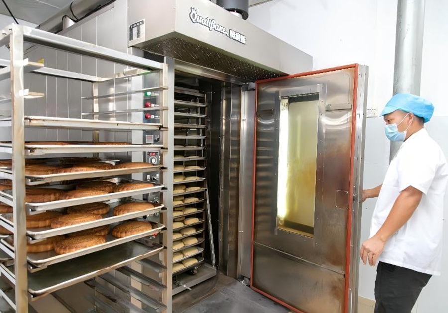 图为月饼厂工人把月饼放进烘焙机里烘焙 张莉萍 供图