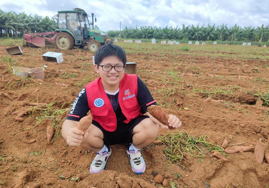 图为实践成员展示红薯丰收喜悦,身后的机器体现科技力量 张莉萍 供图