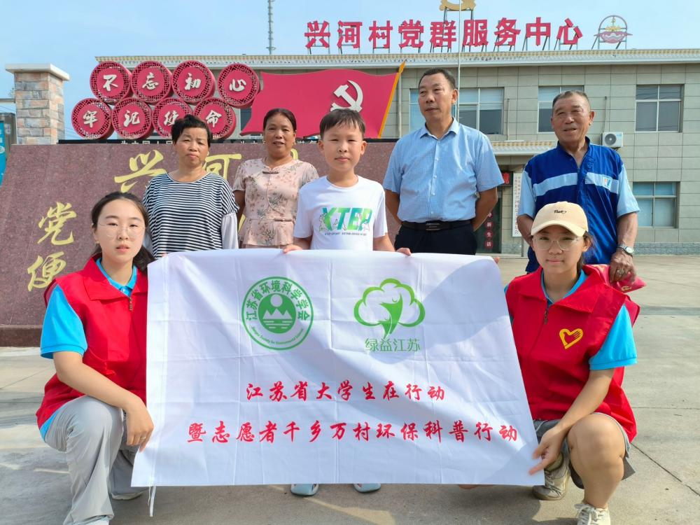 8月6日,小分队沿着新通扬运河顺流而下来到了郭村镇兴河村以及吴桥镇王河村进行调研和宣传。活动开始前,成员李秋慧和朱雨馨向村主任雷如兴了解了兴河村近年来水质治理情况以及河长制实施情况,并且为参与宣讲的村民们发放了宣传读物、明信片和水龙头起泡器实验材料。