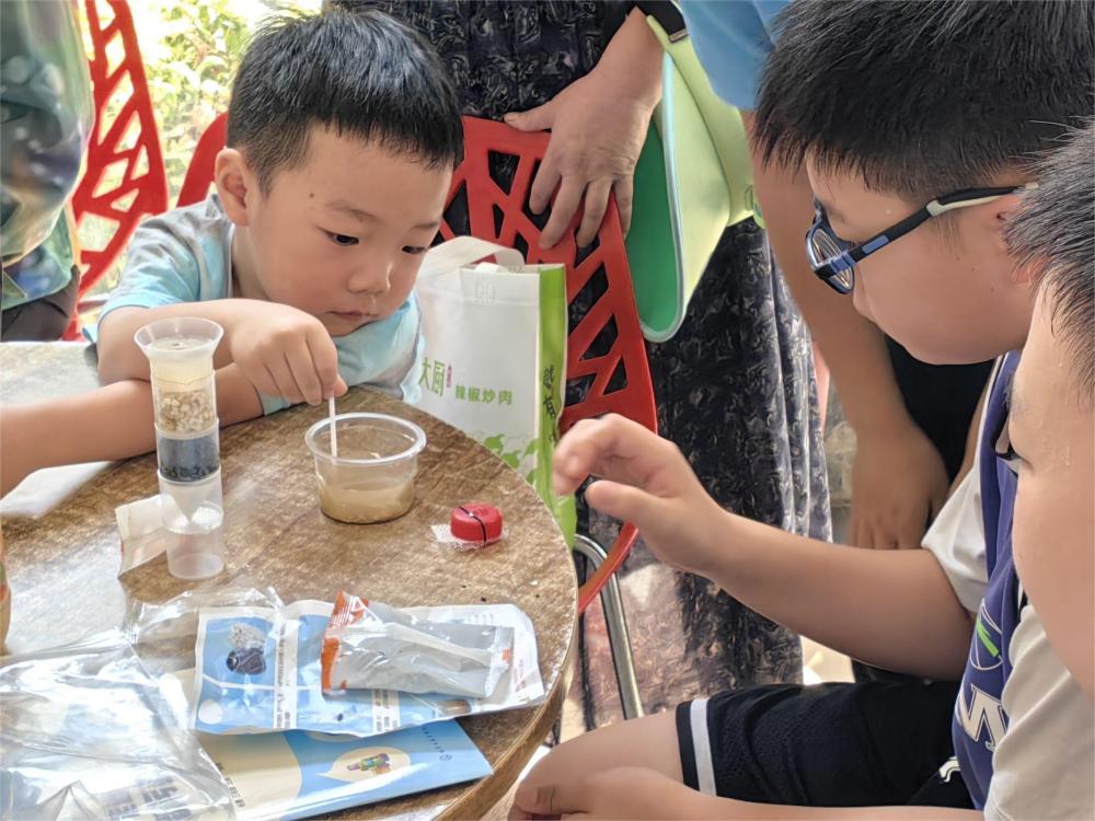 此外,朱雨馨同学向小朋友们演示了简易的污水过滤装置和水龙头起泡器制作方法。演示过后,小朋友们积极尝试,自行制作污水过滤装置。在小朋友制作过程中小分队队员们细心提示,保障小朋友的安全,帮助小朋友完成手工制作。