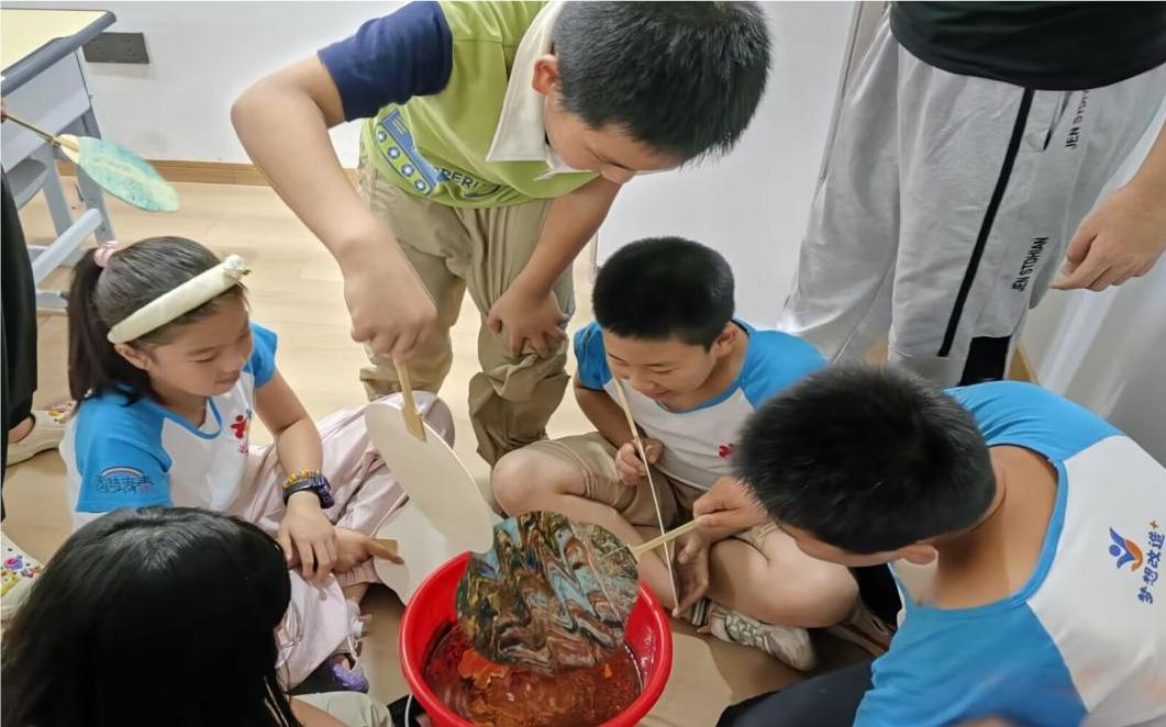 传承扇艺,绘梦童心。为弘扬与传承中华优秀传统文化,“智慧菜园”暑期社会实践团的志愿者们为孩子们带来了一场艺术与文化相交织的漆扇DIY活动。“非遗漆扇是一项水与大漆的艺术,以漆为媒,以扇为纸,最早可以追溯到东汉时期……”从漆扇的起源到色漆搭配推荐,再到“垂直入水”“倾斜式入水”“旋转入水”“Z型入水”等专业上色手法介绍,实践团成员耐心地讲解了漆扇的制作步骤和注意事项,孩子们的眼里也愈发闪烁着跃跃欲试的期待。在上手环节,孩子们跟随实践团成员的介绍,将稀释好的色漆小心翼翼地滴洒在水面上进行设计制作。漆彩调色,纸扇入水;逸态横生,浓姿百出,一幅幅精美的漆扇作品在孩子们的手中诞生。它们或简约大方,或色彩斑斓,每一把都蕴含着孩子们独特的创意和纯真的情感。