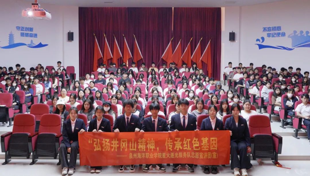 泉州海洋职业学院星火逐光服务队志愿宣讲团通过线上报送材料,线下面试考核。共计招募15名宣讲团成员。团队成立前期,成员自发组织交流研讨会,以共同探讨宣讲制度、工作分工、现有资源等。宣讲团始终坚持传承井冈山精神,着力为群众打造第二红色育人课堂。自项目名单公示以来,“星火成炬”井冈山精神宣讲团开展岗前培训2次,宣讲团从2024年从4月26日-6月5日开展服务活动共41天,面向石狮市泉州海洋职业学院、敬老院、社区、大堡小学等地群体展开宣讲。开展讲座、答题、观影、手抄报、便签寄情、演讲、养老院和校园宣讲、主题团课等多种类型活动开展志愿服务宣讲20次,服务对象3300余人次,累报送工作汇报12篇。