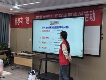团队成员刘玥明在历下区龙信社区进行了专题讲解,对支教地的孩子们上了特殊的“历史教育课”。课程设计重点在“遵义会议精神”,同时拓展了原有的内容,增加了“知识问答”“诗词竞诵”“音影赏析”等趣味互动环节。将遵义会议放置于“红军长征”的历史背景之中,努力为孩子们建立起大历史观,培育历史素养于家国情怀,为孩子们打造了一堂富有教育意义和趣味性的红色课程。