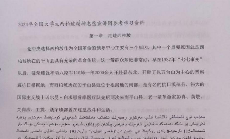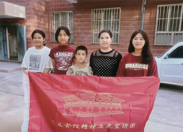 双语宣讲服务当地居民。结合新疆维吾尔族自治区的语言特色,队员木义色尔·艾尼完对红色精神历史资料进行翻译,用汉语+维吾尔语的双语宣讲方式将无形精神内涵可视化,精准传达宣讲内容,准确阐释红色精神。