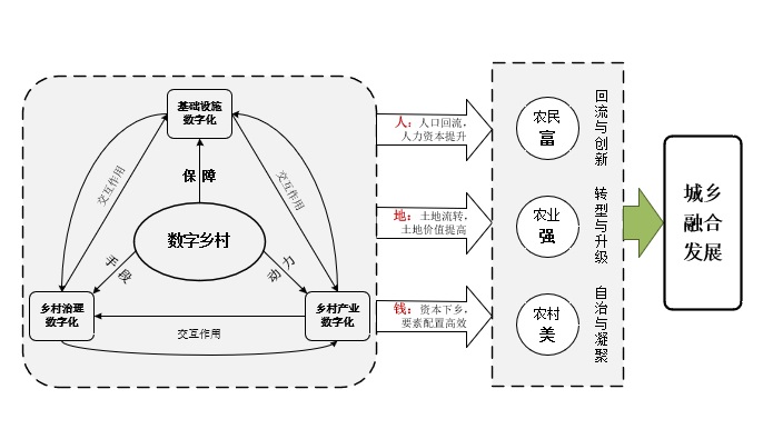 数字作为一种新的要素,具有较强的渗透力,以数字化、信息化和智能化等特征成为城乡协同发展的重要驱动力,并发挥着一定的“乘数效应”。数字乡村建设作为乡村振兴的战略方向,是建设数字中国的重要内容,正在深刻改变着乡村的生产方式、生活方式和社会治理方式。社会实践团队根据调研实际,构建了数字赋能城乡融合发展理论框架,团队认为通过数字化手段,能够有效促进农村产业结构优化升级,提升乡村治理水平,改善农村基础设施建设与人居环境,使得农民富、农业强、农村美,从而缩小城乡发展二元差距,全面提高城乡融合水平。