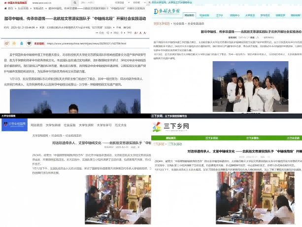 拾文思源实践队搭建五大宣传矩阵。微信公众号“拾文录”推出近30余篇推送,涵盖了非遗调研、中轴探访等内容,全方位、多层次展示拾文思源调研成果;小红书“拾文录”同步非遗项目介绍,推出30余篇笔记,同时紧跟蛇年春晚与国际友人入驻热潮,多模块、多主题传播中华优秀传统文化;哔哩哔哩、抖音“拾文思源实践队”以vlog展示实践队青春风采,以采访视频传播非遗文化,以微型纪录片介绍中轴线建筑,发布共近30条视频;实践队成果全方面更新在拾文思源实践队官网。