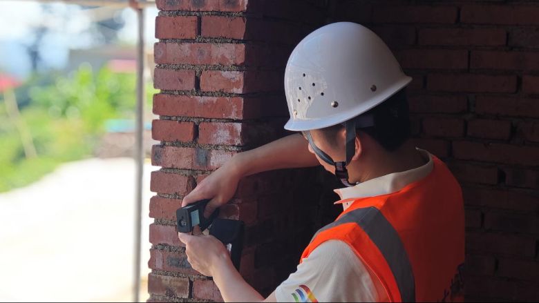 完成新建房检测后,团队转至既有农房区域。对70年代砖房的强度测试显示,虽经历数十年风化,部分墙体强度仍保持安全阈值。团队同步建立"一房一档"电子台账,精准记录房屋结构信息,为后续加固改造提供科学依据。