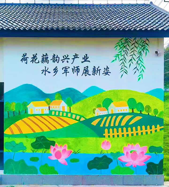 智慧农业学院团队则分赴军师村与西荡村。在军师村,他们巧妙融合当地蓬勃发展的葡萄种植产业与荷乡风貌进行创作,并深入田间地头调研;在西荡村,他们紧扣“荷韵水乡”主题,突出荷藕产业与生态旅游特色,创作前积极听取村干部意见,力求作品深度契合村庄灵魂。