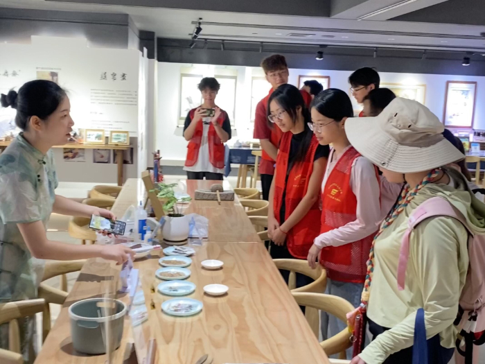 图为实践队员在非遗体验馆听讲解员介绍绣帛画 桂林航天工业学院计算机协会供图