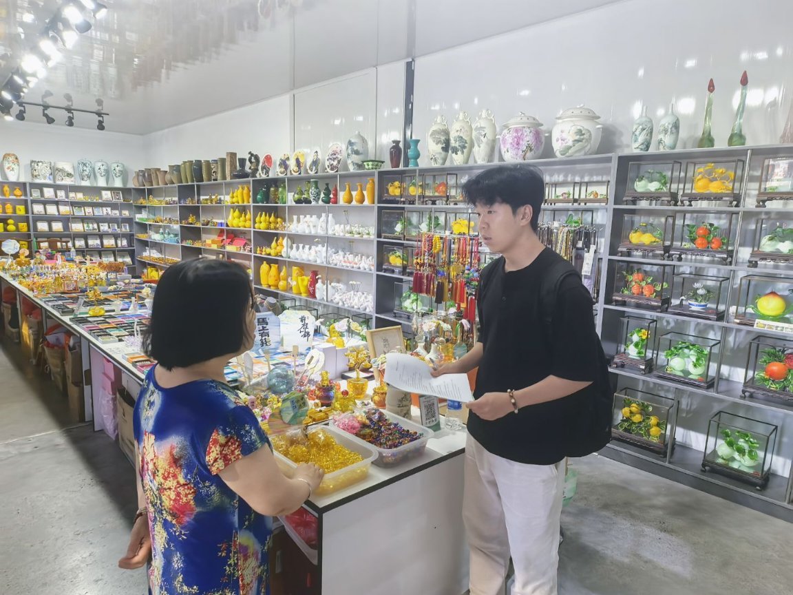 下午,实践队来到博山琉璃大观园。这里琳琅满目的琉璃制品让人目不暇接,从精致的摆件到实用的器皿,琉璃商品种类繁多。队员们一边欣赏着这些琉璃制品,一边对其价格进行调查,并向商户和顾客发放调查问卷,了解市场对琉璃制品的需求和反馈。