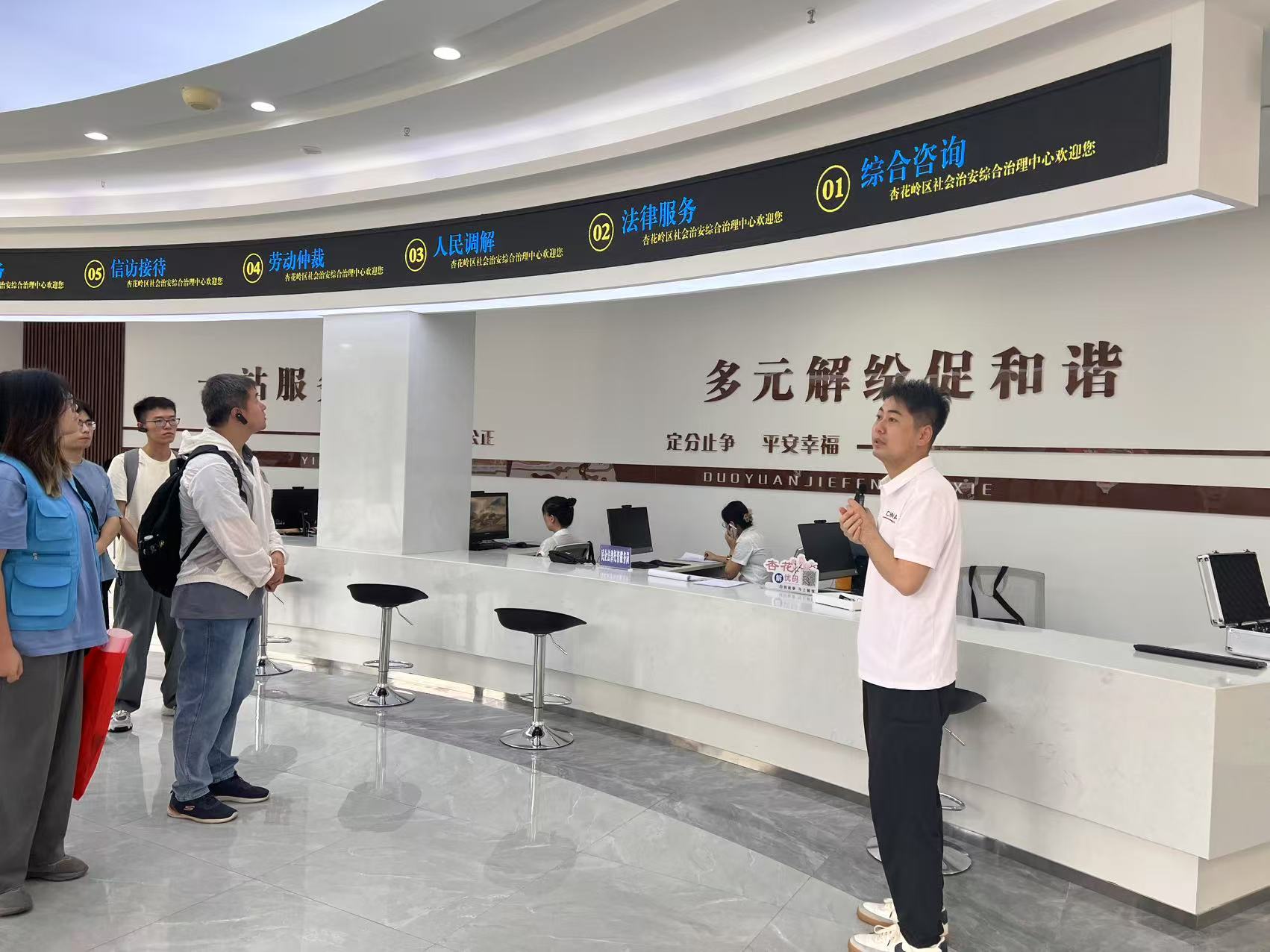 实践队走进太原市杏花岭区社会治安综合治理中心(以下简称“综治中心”),参观其联动的法院、检察院等相关机构及部门的办公区域与设施,深刻体会综治中心在促进社会和谐、保护未成年人、提升治理效能方面的核心意义和先进性。