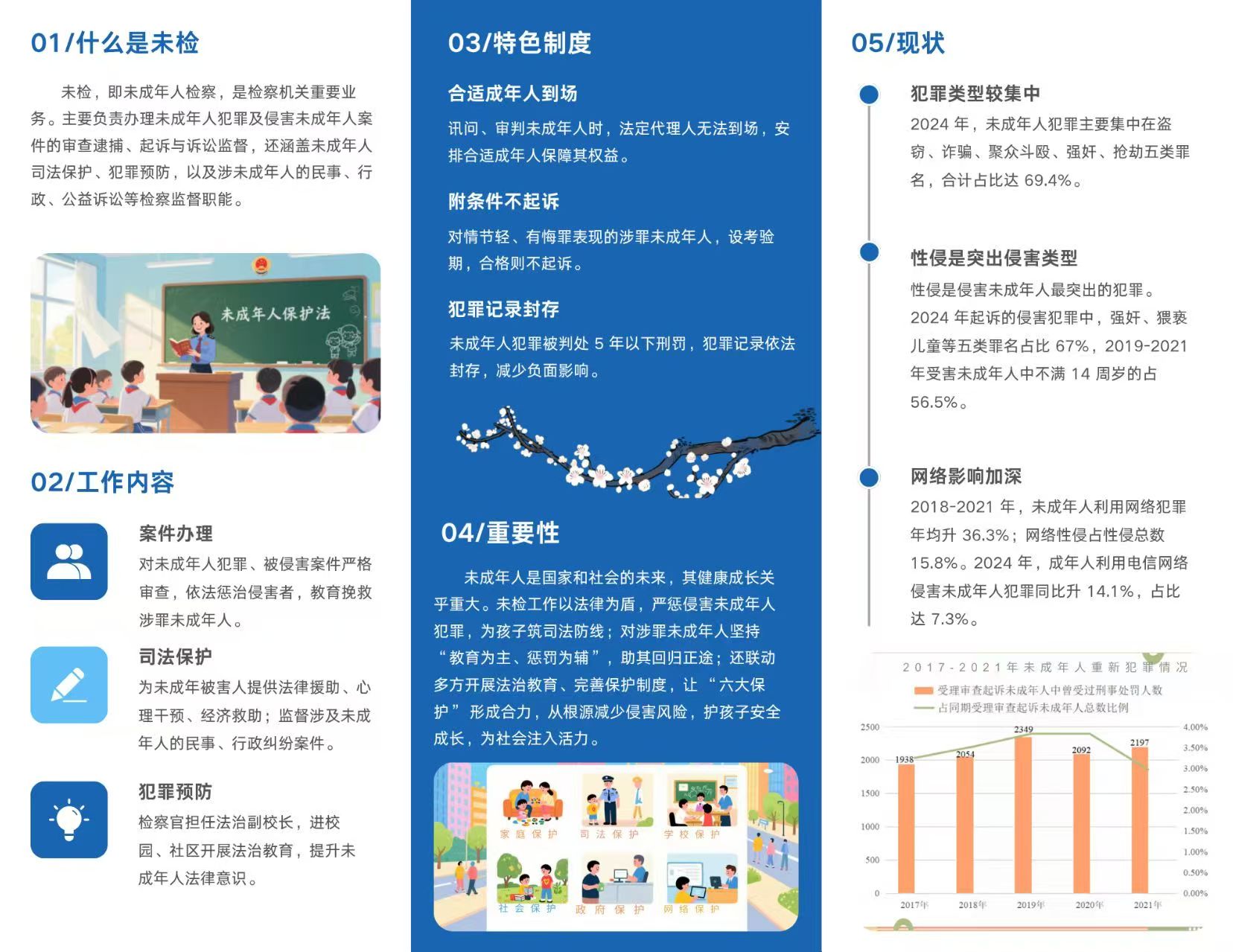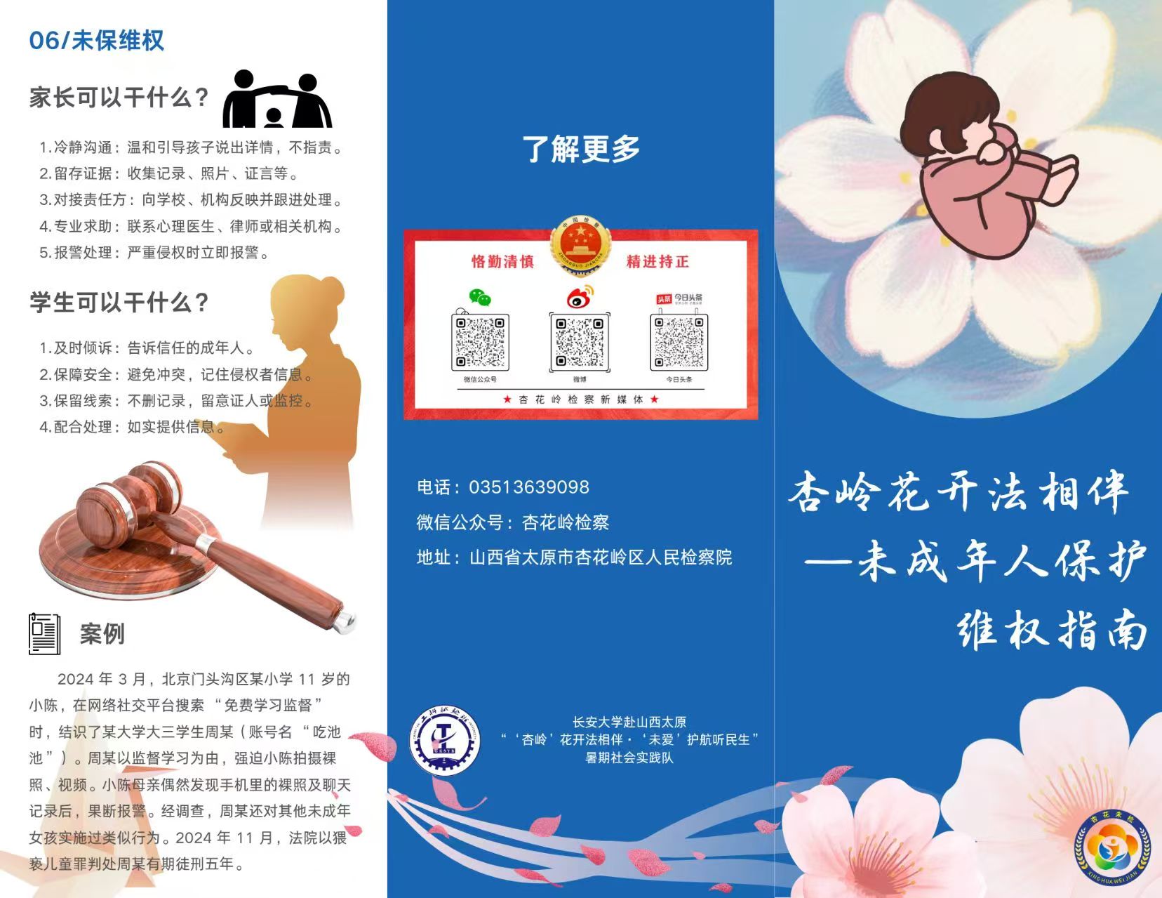 在太原市杏花岭区人民检察院第一检察部的指导下,实践队设计了宣传未成年人检查工作海报和相关权益维护指南,为“未检”工作进社区提供了有力的基础支撑。宣传素材聚焦“强制报告”义务和《未成年人保护法》中涵盖的家庭保护、学校保护、社会保护、网络保护、政府保护和司法保护“六位一体”保障体系,引导社会各界关注、了解、关心和支持未成年人检察工作。