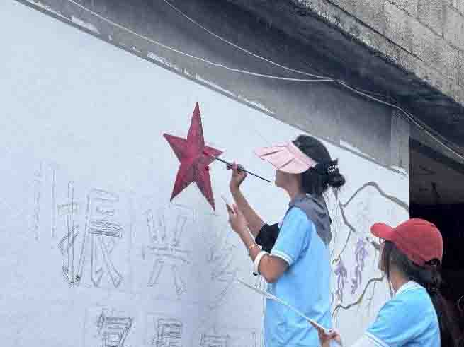 文化振兴需要看得见的精神符号。实践队聚焦村主干道墙面开展乡村振兴主题墙绘。队员们分工协作,将遒劲紫藤枝蔓、串串藤花与红五星历史印记相呼应,搭配 “乡村振兴”等标语,使单调墙面转化为串联历史记忆与乡村新貌的 “文化宣传栏”。村民纷纷驻足观赏这承载过往与希望的画面,整个村庄因这抹缀着紫藤花影的独特色彩,焕发出跨越时空的生机与活力。