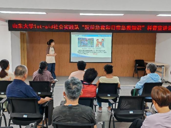 1st-Aid社会实践队深入济南鞭指巷社区和青岛铁山花园社区等老年人聚集地,精心打造"银龄守护"急救宣讲专场。队员们以"听得懂、学得会、用得上"为宗旨,采用"理论讲解+情景演示+答疑解惑"的三维立体宣讲模式,为老年朋友们带来了一场别开生面的急救知识盛宴。除系统讲解心肺复苏术外,实践队更聚焦老年人常见突发状况,重点传授"海姆立克急救法"、跌倒自救技巧、心脑血管疾病早期识别等实用技能。通过剖析"掐人中能救命"、"摔倒后立即扶起"等常见急救误区,用通俗易懂的语言和生动案例,让专业的急救知识真正走进老年人的日常生活,为银发群体筑起一道坚实的安全防线。活动现场气氛热烈,居民们围绕自身关心的问题积极互动。"急救时咋判断该不该动手?""要是中风了去医院及时能不能好啊?"面对这些具体而实际的问题,队员们一一耐心解答。22级生物医学科学专业庞睿奇同学深有感触:"看到老人们热情的提问和认真的记忆,我深刻体会到急救科普的价值。只有真正站在老年人的角度思考,用他们能理解的方式讲解,才能让急救知识落地生根。这次经历让我明白,医学不仅要专业,更要有人文温度。"这种设身处地为老年人着想的科普方式,赢得了社区居民的一致好评。