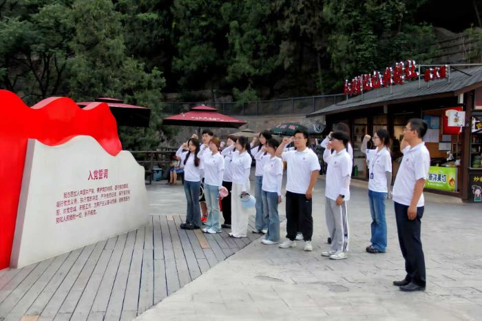 实践团走进河南林州和开封红色教育阵地,在沉浸式学习中感悟红色精神。红旗渠被誉为世界第八大奇迹,全长1525公里,是林县人用一锤一钎凿出的生命线。实践团观展物、爬山道、摸凿痕,触摸先辈掌心温度。实践团成员还化身为当年建设者,抡“山锤”、推“小推车”、扛“太行石”、打“团结夯”、品“民工餐”,深切感受着“人定胜天”的壮举。随后,实践团在“青年洞”向党旗宣誓,铮铮誓言仿佛与当年建渠呐喊跨越时空交织。在焦裕禄纪念馆、谷文昌纪念馆和扁担纪念馆,实践团凝视着布满洞口的藤椅、治沙网的格图、磨出包浆的扁担,听着“贴膏药”“扎针”通俗治沙口诀、焦裕禄“死了也要看着兰考治沙”的信念和祭祖先祭“谷公”的习俗,实践团成员心灵无不被震撼和感染。那是强忍剧痛伏案工作的忘我精神、脚底板量规律的务实调研态度、宁愿自己多跑十里,不让群众多走一里的扁担精神和一切为了群众的为民情怀。实践团深切感悟到这些带着温度的历史注脚正是需赓续的精神火种。此刻,“扎根大地、造福人民”的精神基因在青年心中扎根生长。当年先辈用脚步丈量数据、用智慧破解难题,如今学子们以数学模型寻最优解、以数据分析促产业升级,变的是技术手段,不变的是“为人民谋幸福”的初心传承。