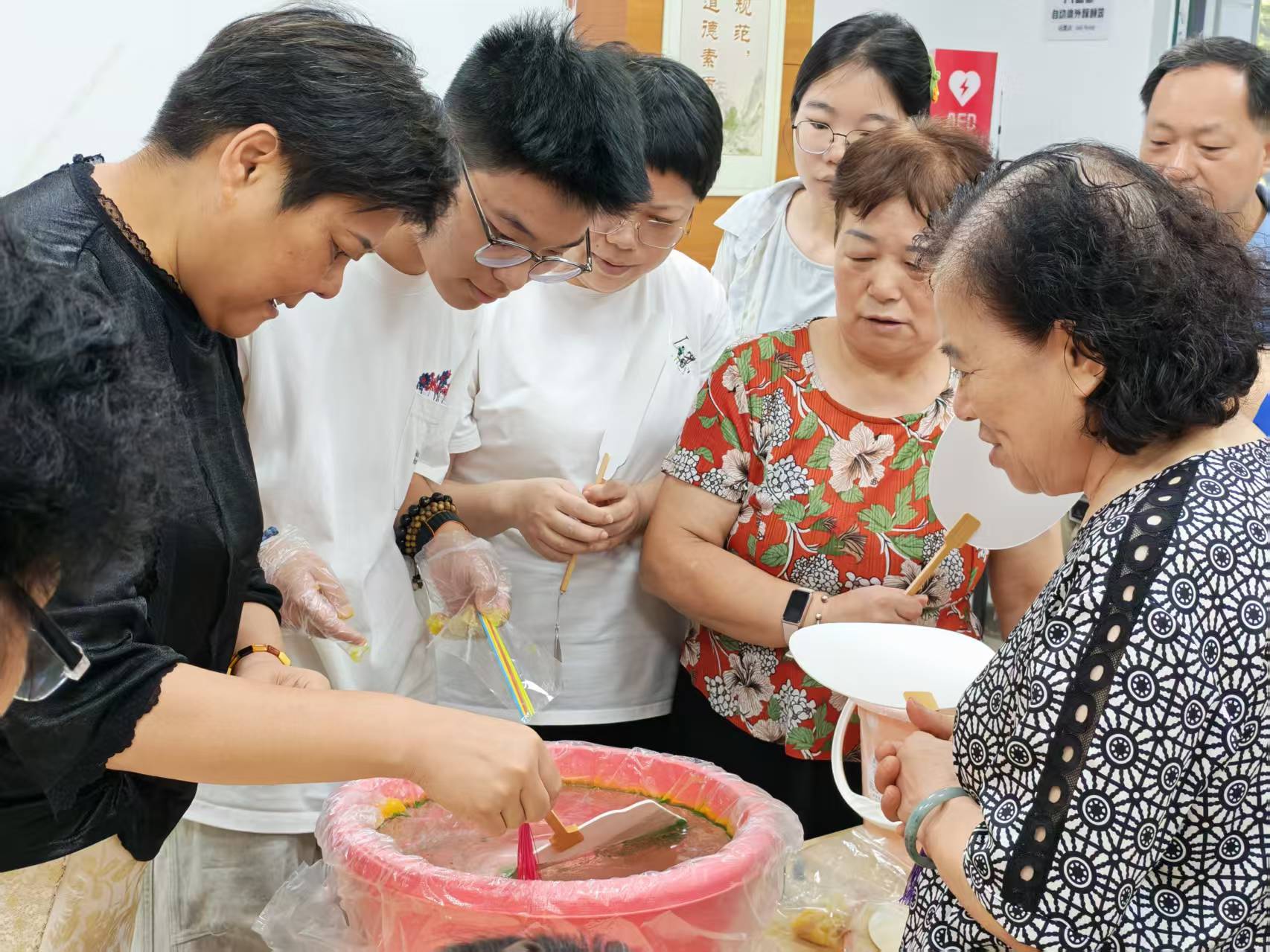 随后,志愿者现场演示调漆过程。他拿出几种不同颜色的漆料,向大家展示,然后取来一个水盆,开始将不同颜色的漆料按比例滴入。“调漆的比例很关键,不同的比例会调出不同的颜色效果。” 志愿者一边操作,一边向居民们讲解。居民们不时就漆扇制作的细节向志愿者提问,“志愿者,调漆的时候需要注意什么呀?”“漆扇做好后,要多久才能干呢?” 志愿者都一一耐心解答。