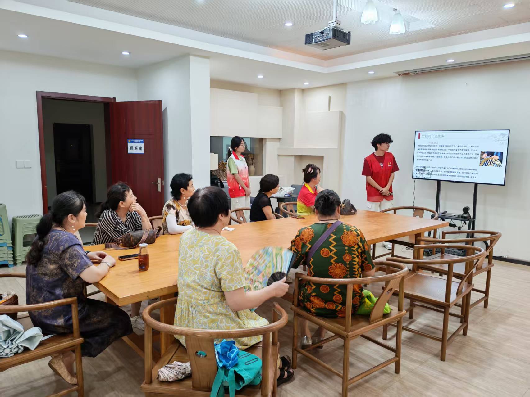 志愿者首先走上前,向老人们介绍竹编扇的悠久历史。“竹编扇在古代是文人雅士喜爱的风雅之物,后来逐渐在民间流传开来,成为大家常用的实用工艺品……” 志愿者通过大屏幕展示出一幅幅竹编扇的历史图片,老人们看着图片,听着讲解,不时发出赞叹声。