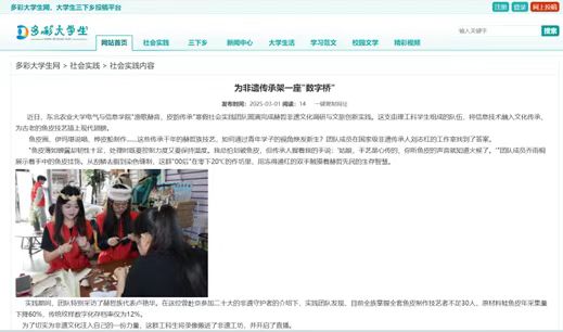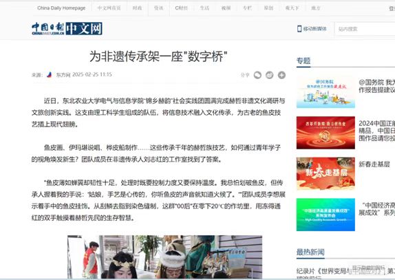 此外,团队还积极向中国日报、多彩大学生、三下乡网等网站投稿,发表文章,让更多的人能够领略赫哲族深刻的文化底蕴。通过这些宣传渠道,“锦乡赫韵”社会实践团为非遗传承注入了源源不断的青春活力,让赫哲族非遗文化在新时代焕发出新的光彩。