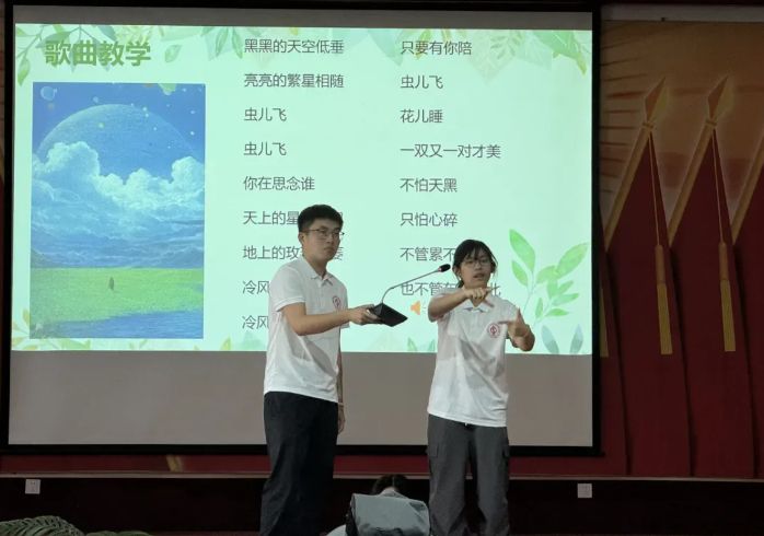 “手语会开花”课堂上,实践团以童谣《虫儿飞》为创意载体,精心设计趣味教学:教孩子们用手掌模拟“夜空低垂”,用指尖轻点再现“繁星闪烁”,把“你好”“谢谢”等手势化作连接有声与无声世界的纽带。当夕阳下,孩子们举着小手,用略显笨拙的动作同步演唱童谣时,实践团成员深切感受到,这场由团队主导的手语启蒙,不仅播撒了语言交流的种子,更让“尊重差异、传递温暖”的理念扎根童心,成为一堂兼具温度与意义的成长课。