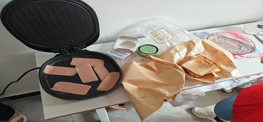 太极活动结束后,志愿者们与服务中心工作人员迅速投入三明治制作的筹备工作。大家分工明确:有人仔细清洗生菜、黄瓜等新鲜蔬菜,确保食材洁净;有人有序整理全麦面包、低脂火腿等原料,按类别摆放整齐;还有人调试制作工具,为接下来的互动环节做好充分准备。阳光透过窗户洒在操作台上,各色食材错落有致,营造出温馨的活动氛围。