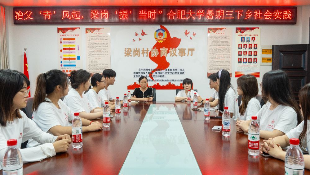 上午9点,实践团队从合肥大学出发,正式开启“三下乡”社会实践旅程。到达庐江县后,团队奔赴梁岗村党群服务中心,与梁岗村村委会开展交流座谈会。