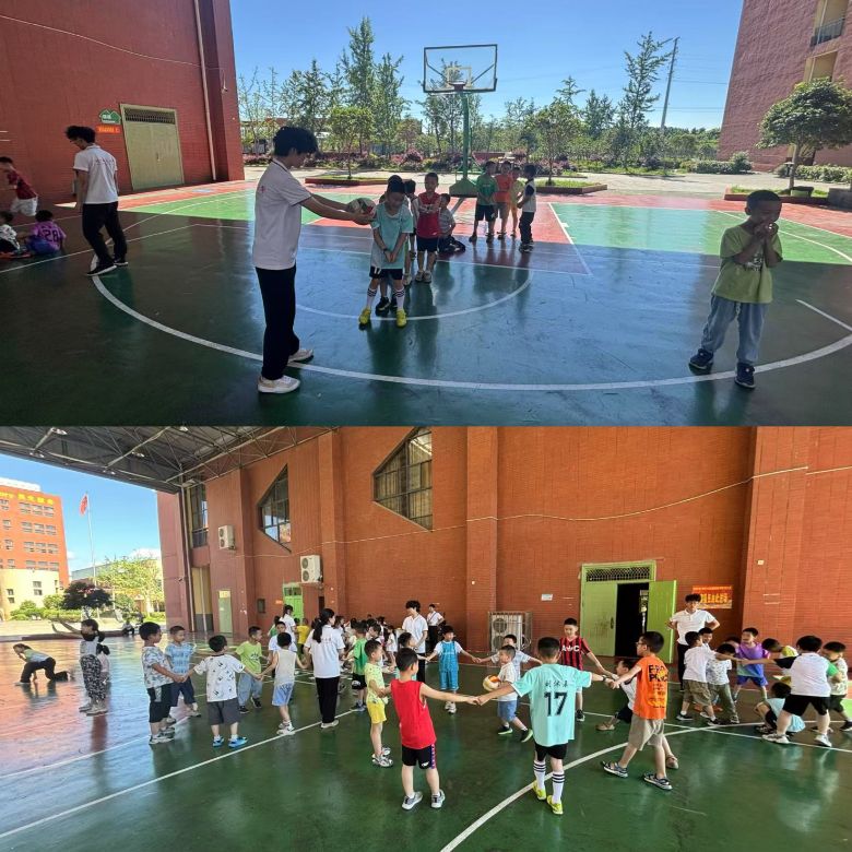 本节课教的是如何颠球,王老师说:”双脚前后或左右开立,间距与肩同宽,膝盖微屈,身体重心稍前倾,保持放松且便于移动的状态;双手手指自然张开,掌心相对,两臂伸直,手腕下压,将双手前臂内侧并拢,形成一个平面。”小朋友们纷纷照做,王老师接着说:“颠球时,主要通过手臂的上下摆动来控制球的高度和方向,而非用手腕或手指猛力击球,手臂摆动幅度要小,靠小臂的力量将球轻轻向上“抬”起。”通过王老师和皮老师的细心教导,小朋友们很快掌握了颠球的方法。