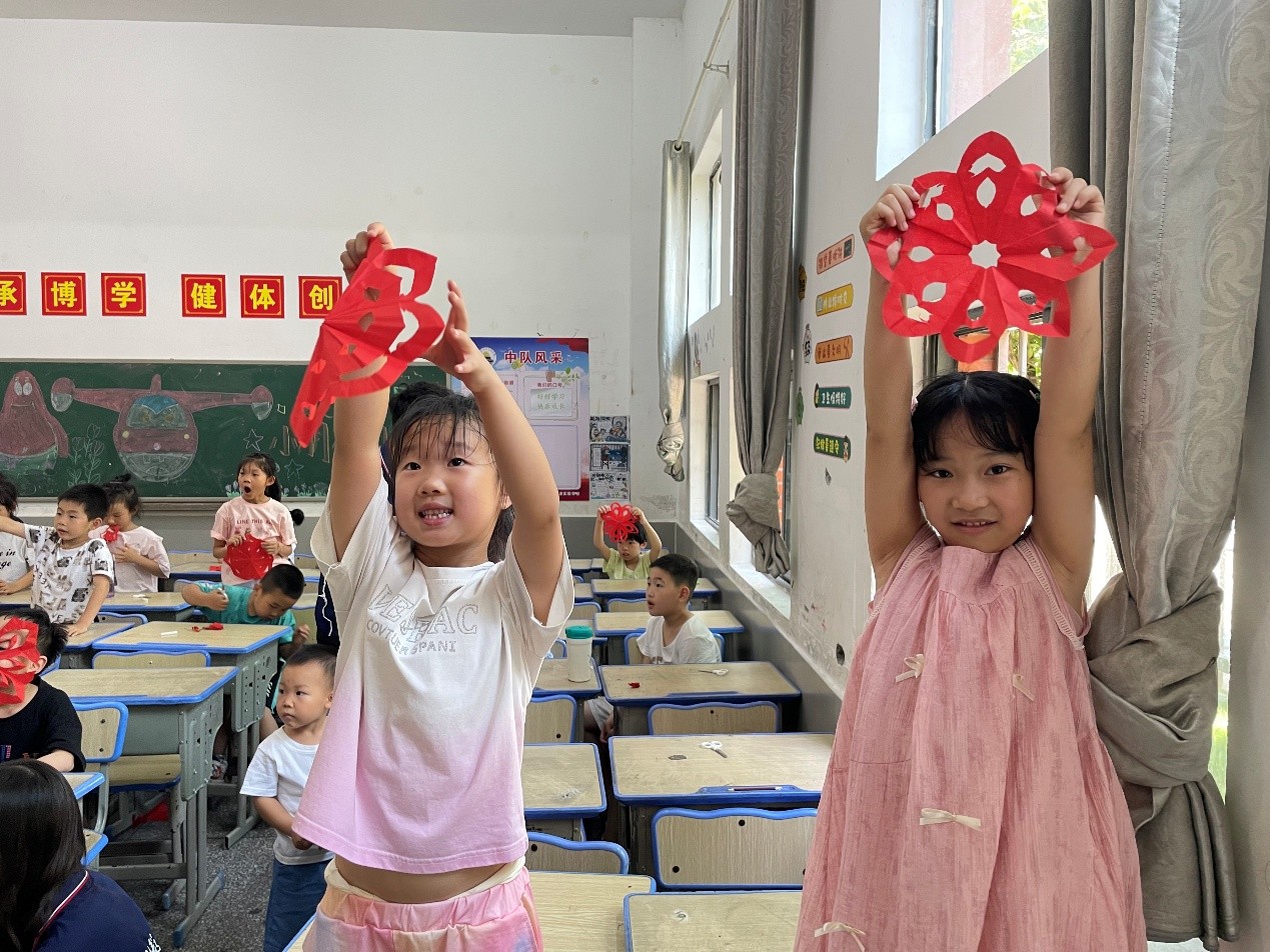 与此同时,音乐教室里歌声飞扬。老师从发声练习入手,教唱励志歌曲,孩子们跟随着旋律,用稚嫩的嗓音传递欢乐与希望。手工课上,支教老师化身剪纸导师,手把手教授窗花剪裁技巧。红纸在孩子们指尖翻飞,不一会儿,镂空的花朵、灵动的蝴蝶等精美窗花作品纷纷呈现。